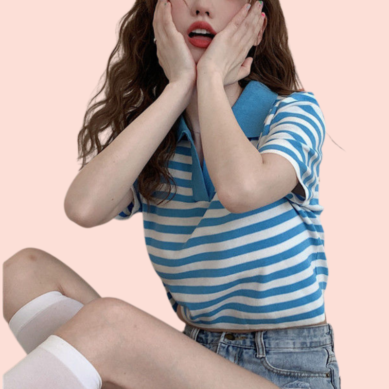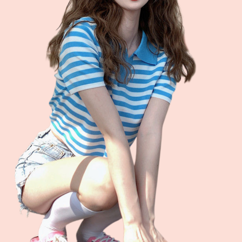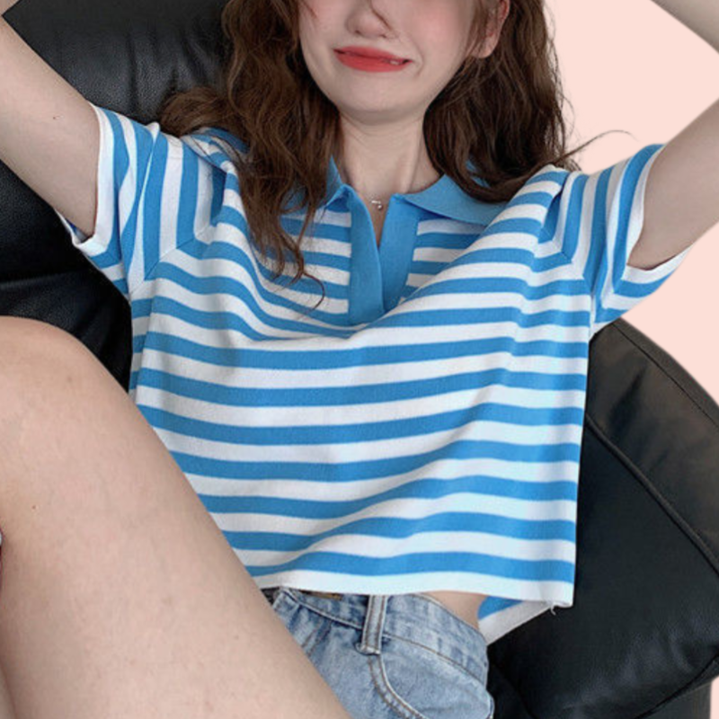 ストライプ柄のショート丈Tシャツは、トレンド感とスタイルアップ効果が特徴。軽やかな素材で快適な着心地。