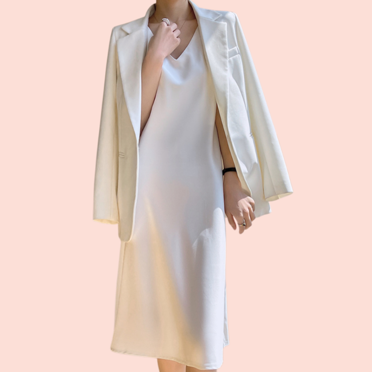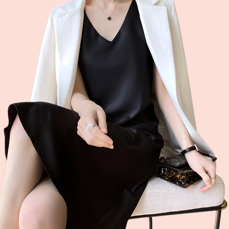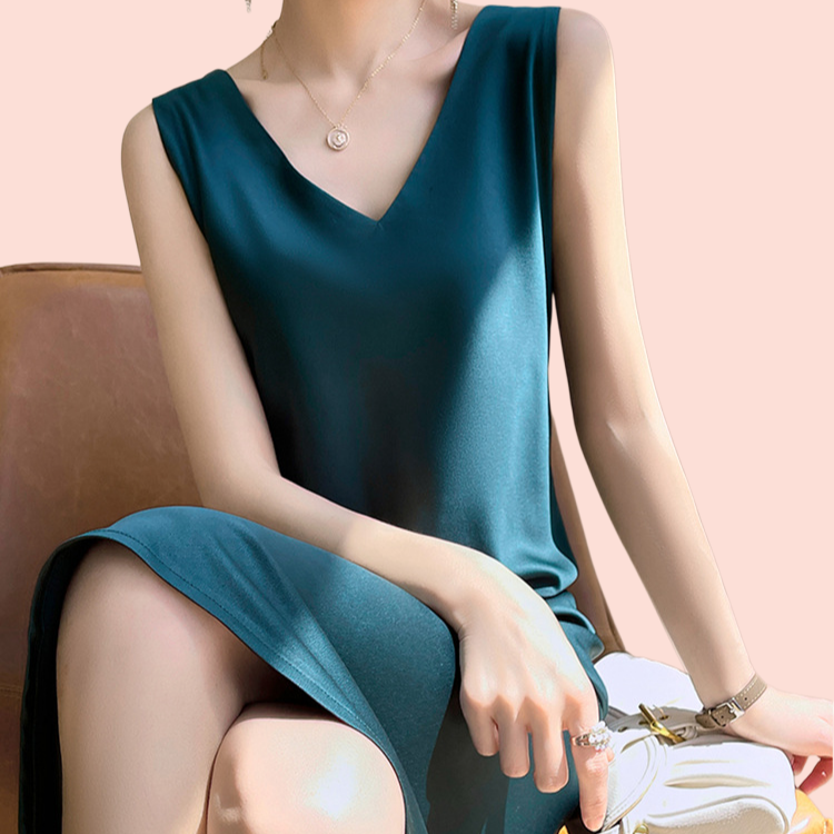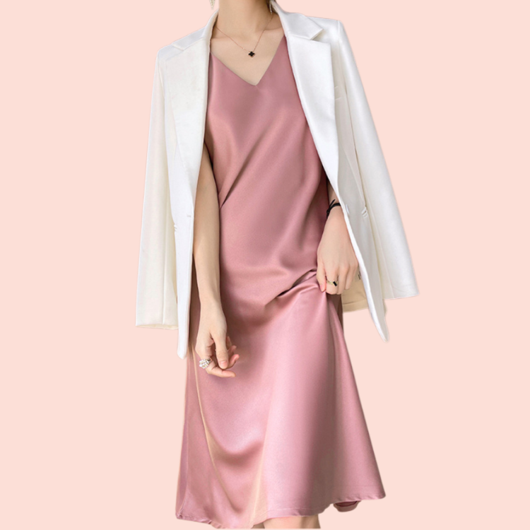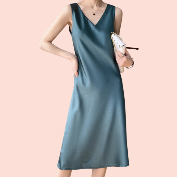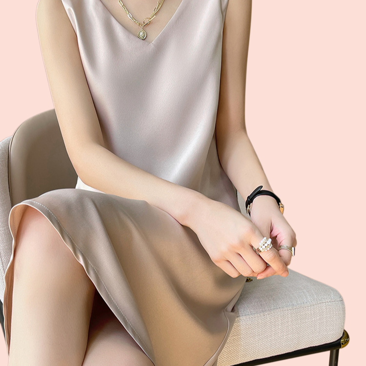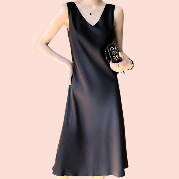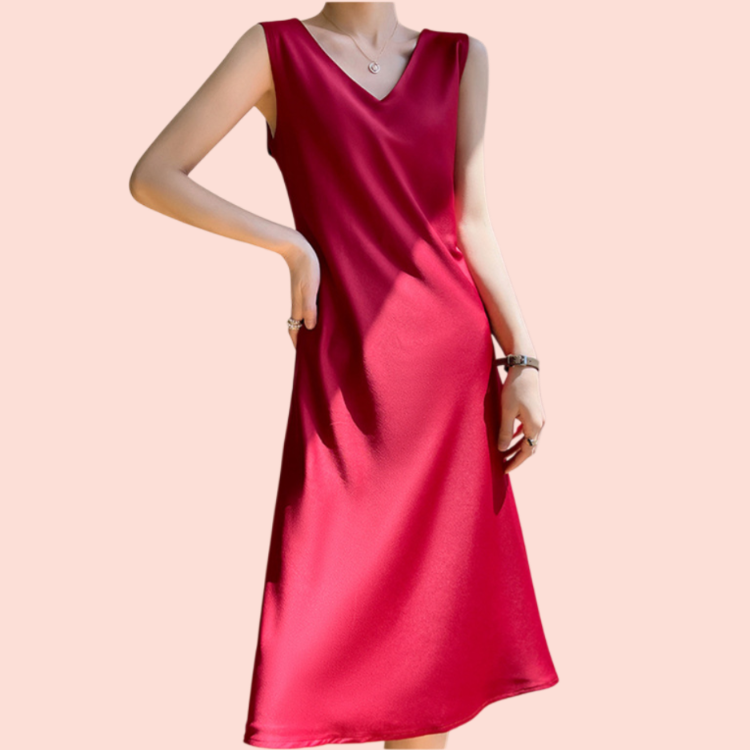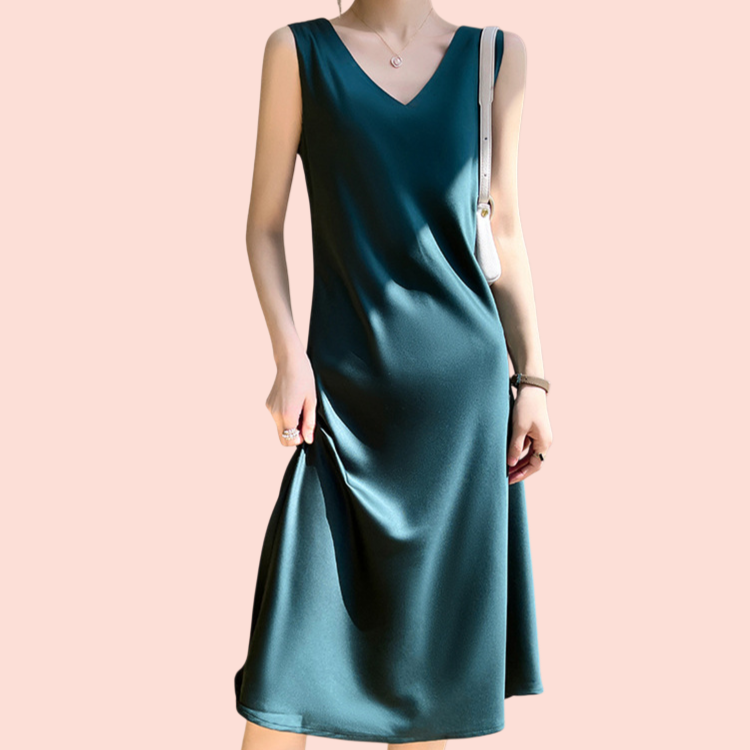 光沢感が美しいサテン素材を使用したキャミソールドレス。シンプルデザインで着回し自在、パーティーやデイリーにも最適。